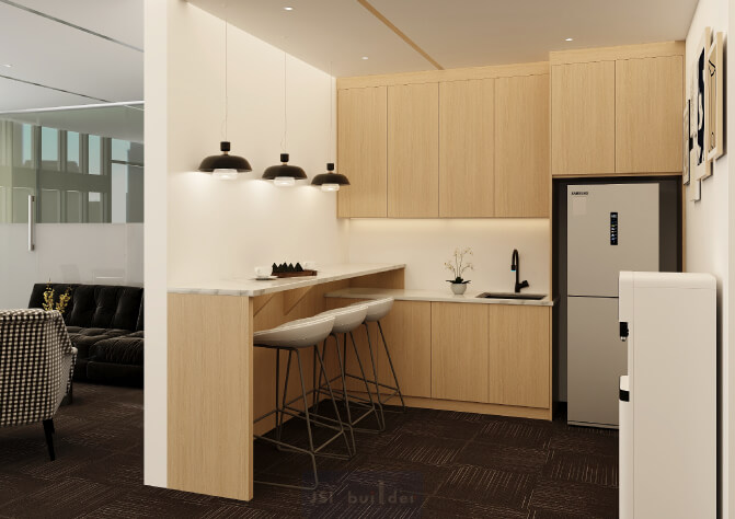 Experience the pinnacle of modern minimalist design with our latest factory project. This renovation features a minimalist concept that combines sleek wooden and white cabinets, offering a clean, organized look that enhances both functionality and visual appeal.