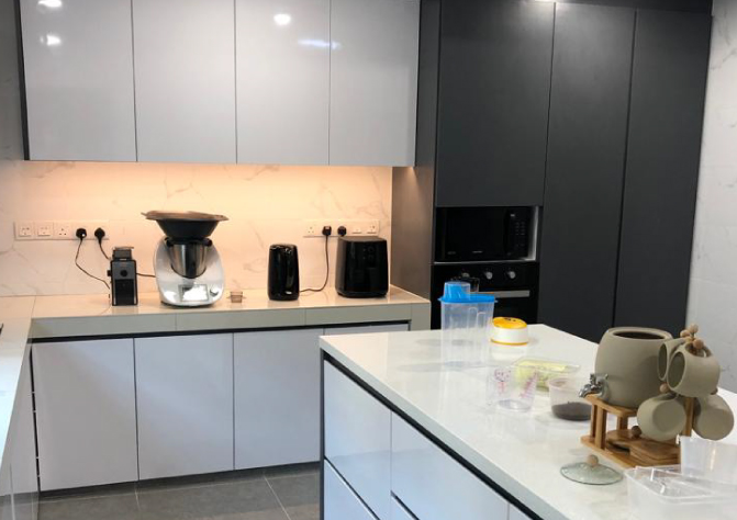 Experience the sophisticated allure of Modern Contemporary design with our latest double-storey project. This design features a stunning white marble backsplash paired with sleek black cabinets in the kitchen, creating a bold and stylish focal point. In the rooms, the harmonious blend of white and wooden cabinets adds warmth and elegance, enhancing the overall aesthetic.